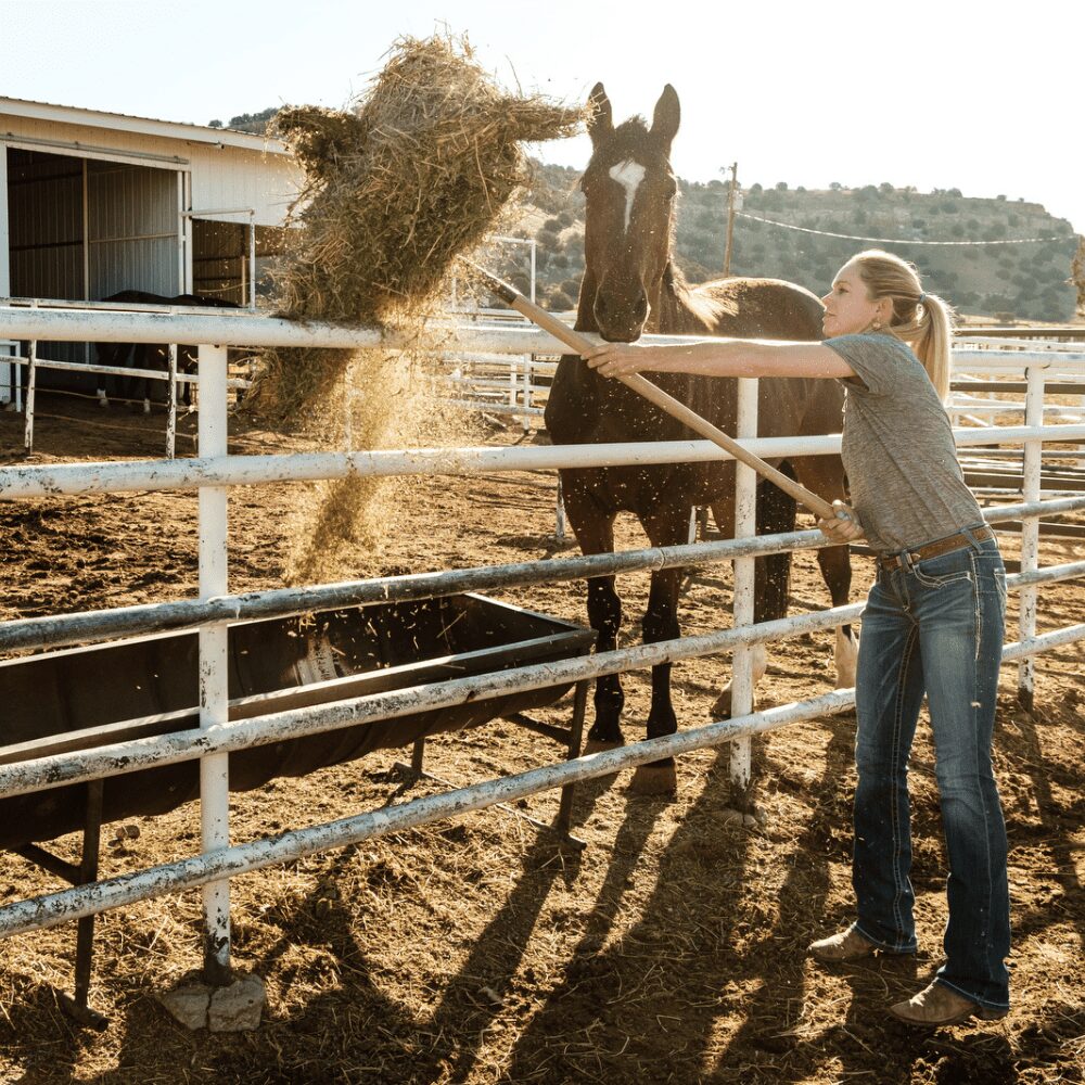 COWGIRL LIFE Feeding Performance Horses In 5 Easy Steps With Alltech By CG Social Team | March 13, 2023 Share It’s important not to overcomplicate equine nutrition. While performance horses often have more specific nutrient requirements than the average riding horse, all horses have the same general needs, and keeping it simple when it comes to feeding is the best method for achieving optimal health and wellness. Here, we will break it down step by step so that you can make sure your horses receive exactly what they need. 1. Determine your horses’ energy needs. First and foremost, it’s important to take an honest inventory of your horse’s training regimen. According to the National Research Council (NRC), there are four categories of activity level and intensity: Light exercise: 1-3 hours per week of mostly walking and trotting. Moderate exercise: 3-5 hours per week of mostly trotting, with some walking and cantering and some skilled work. Heavy exercise: 4-5 hours per week of trotting, cantering, galloping or skilled work. Very heavy exercise: 1 hour per week of speed work and/or 6-12 hours per week of slower work. Generally, the only horses that fit into the “very heavy” category are racehorses, endurance horses or elite 3-day eventing horses, while most others fit into the light or moderate categories. It’s very easy for us to overestimate our horses’ workload. Keep in mind that modern horses evolved from animals who often traveled 40 to 50 miles per day! They had to really work for their meals, which is not the case for domestic horses. You may be surprised to learn that some horses who do light to moderate exercise do not require energy in amounts much higher than what is needed for maintenance. On the other hand, some performance horses require up to twice as much energy as a horse at maintenance. It’s all about taking each individual animal’s unique blend of genetics, age and metabolism into account, as well as their exercise intensity and duration. A qualified equine nutritionist can help you determine the right nutrition regimen for your horse. 2. Always evaluate your hay. Energy can be supplied in the diet by carbohydrates and fat. Carbohydrates fall into two categories: structural and non-structural. Non-structural carbohydrates (NSCs) come from sugars and starches, which are found primarily in grain concentrates. Most performance horses require some form of NSC, though it is important to limit NSCs in the diet to what the horse really needs based on its age and exercise intensity. Structural carbohydrates, on the other hand, include fiber from forage sources and are one of the most critical components in making sure that the horse’s hindgut functions optimally. The large intestine in the horse’s digestive tract is home to billions of beneficial microbes that digest fiber and produce volatile fatty acids (VFAs), which are used as a source of energy. This is the reason why hay alone can meet the energy requirements of some horses. Fiber helps keep the large intestine at the correct pH balance and greatly reduces the risk of colic. After all, forage is what horses were designed to eat and should always be fed at a minimum of 1% of the animal’s body weight per day. The forage component of a horse’s diet also takes pasture grasses into account, so be sure to factor in how much turnout your horse receives. If you are feeding performance horses, invest in hay tests, which will determine exact nutrient levels and help you ascertain which additional nutrients need to be added to the diet in the form of grain or supplements. 3. Consider the importance of water and salts. While these nutrients are often overlooked, adequate access to fresh, clean water and iodized salt is crucial for all animals, but especially for performance horses. When exercised in hot, humid weather, horses can lose up to 4 gallons of sweat per hour! Horse sweat is hypertonic, meaning that it contains higher levels of electrolytes than what is circulating in the body. Human sweat, in contrast, is hypotonic, meaning that there is a higher concentration of electrolytes circulating in the body than what is in our sweat. This means that giving a sweaty horse plain water will only further dilute the concentration of electrolytes in its body. Given that electrolytes are required to maintain the fluid balance and electrical activity of each cell, they are tremendously important for performance! In normal circumstances when a horse is only emitting small amounts of sweat, an iodized white salt block or loose salt, in addition to hay and grain, will do the trick. If weather and exercise — or some other form of stress, like long-distance travel — leads to prolonged, excessive sweating, providing a high-quality electrolyte supplement with potassium, sodium and chloride is a very good idea. 4. Don’t overdo it on protein. Many horse owners misunderstand how protein should be used in their horses’ diet. Adding energy/extra calories to the diet should be done with carbohydrates or fat. While protein is required for growth, muscle and body system maintenance, protein is a relatively inefficient energy source. Horses do have specific requirements for essential amino acids, the most important of which are lysine, methionine and threonine. This is another reason why investing in a hay test will help you to balance your performance horse’s diet. Horses doing light work can often meet their protein requirements (approximately 10% of their diet) from hay and pasture and the use of a ration balancer. Horses doing moderate to heavy work have higher protein requirements, which can typically be met with commercially fortified grain and/or the addition of alfalfa hay. 5. Help minimize and manage stress. While we know performance horses endure stress, we can forget its ability to impact nearly every system in an animal’s body. As such, managing performance horses includes taking several things into acco